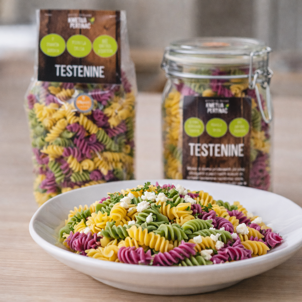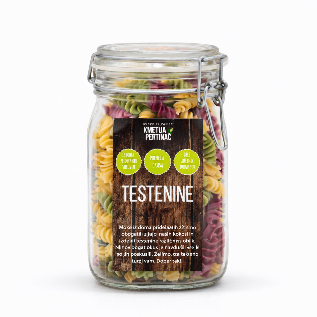 Barvite testenine s kmetije Pertinač, obarvane z naravnimi sestavinami rdeče pese in špinače, v ličnem 350 g kozarcu. Odlična izbira za darilo ali gurmanske užitke.