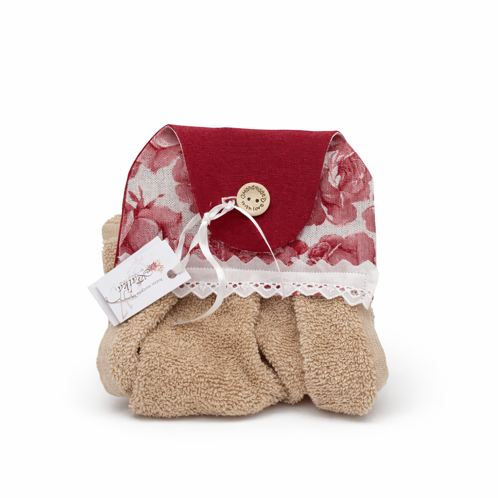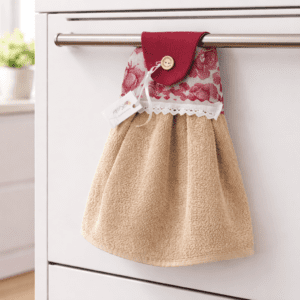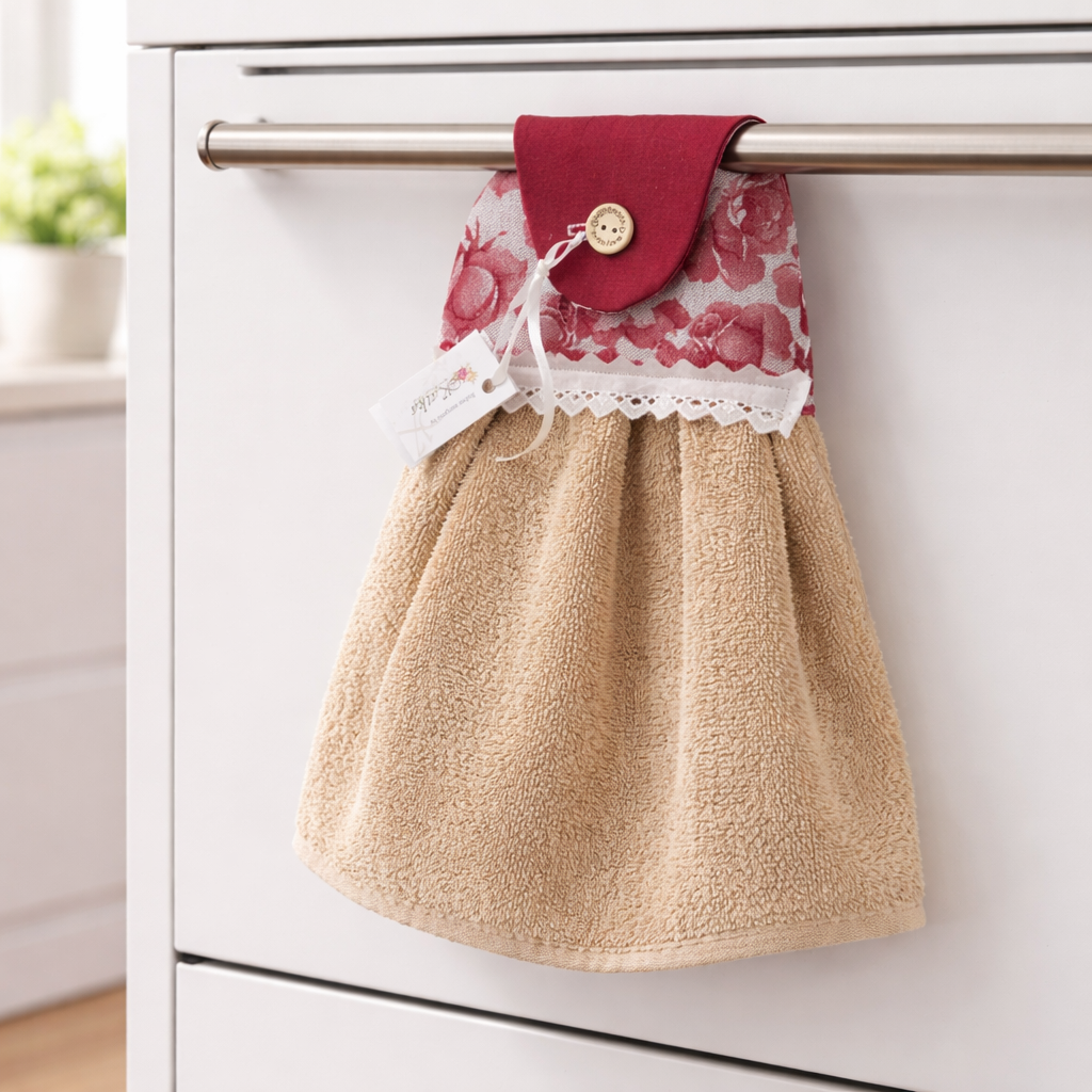 Ročno narejena kuhinjska brisačka iz mehkega blaga z gumbkom za pripenjanje. Uporabna in dekorativna, na voljo v različnih barvah in vzorcih.
