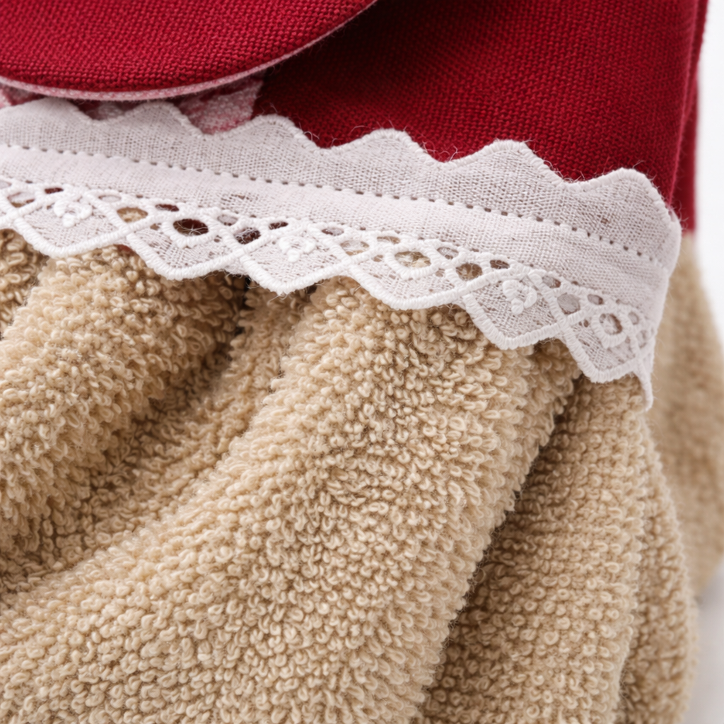 Brisačka za v kuhinjo je ročno narejen Katkin izdelek, ki združuje uporabnost in estetski čar. Izdelana je iz mehke in vpojne tkanine, zgornji del pa krasi dekorativno blago z vzorcem in lesen gumbek, ki omogoča enostavno pripenjanje na različne kuhinjske elemente – ročaje, kljuke ali pečice.