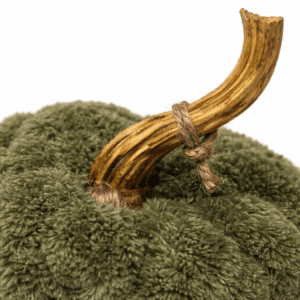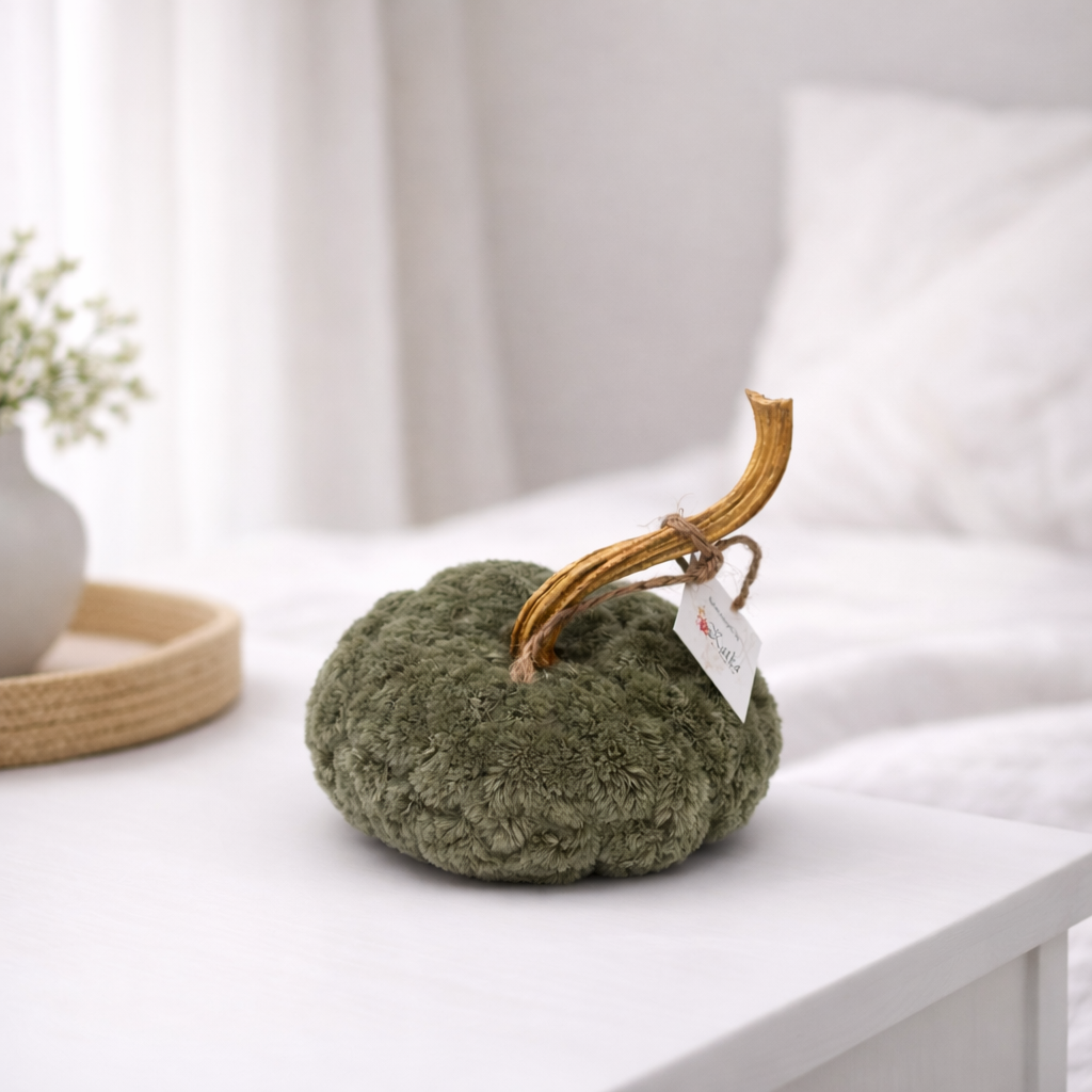 Ročno narejena dekorativna bučka iz mehkega blaga z naravnim pecljem, napolnjena z mehkim polnilom. Na voljo v različnih barvah in velikostih.