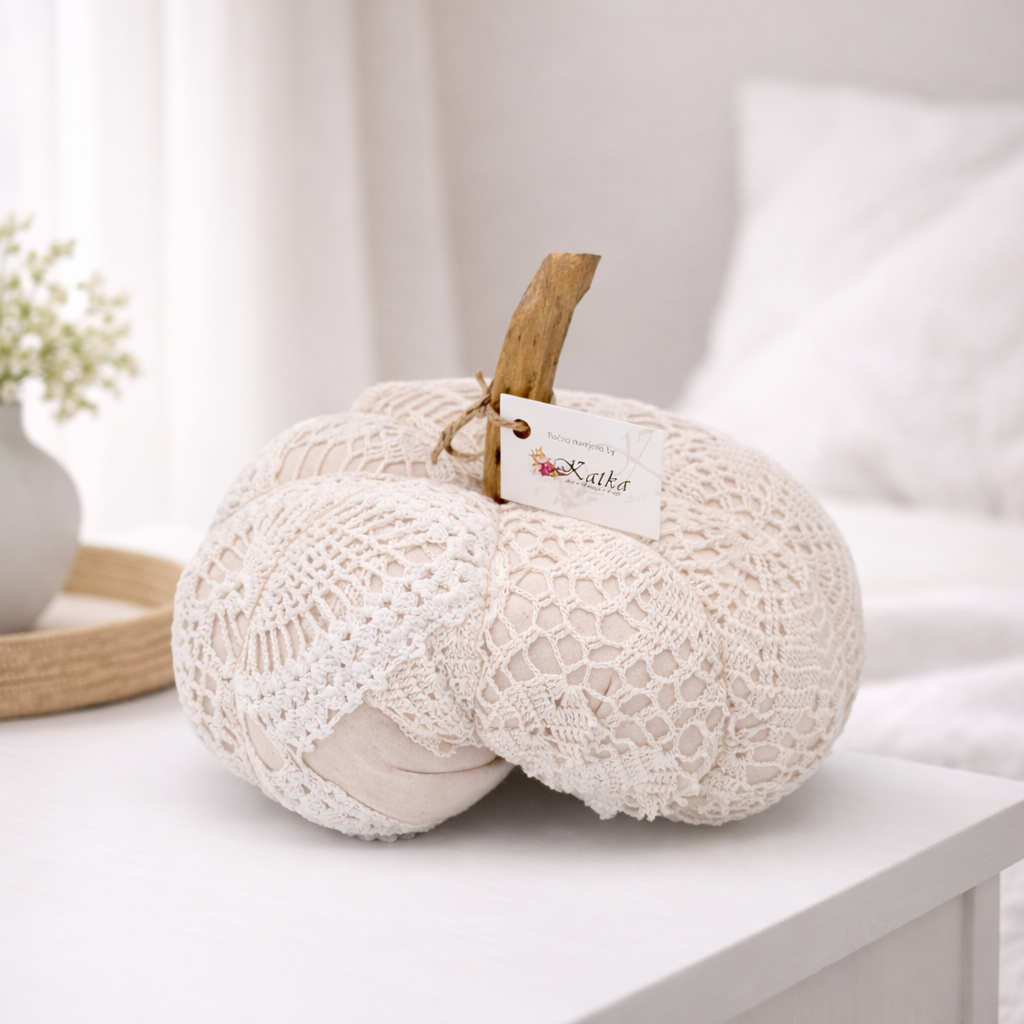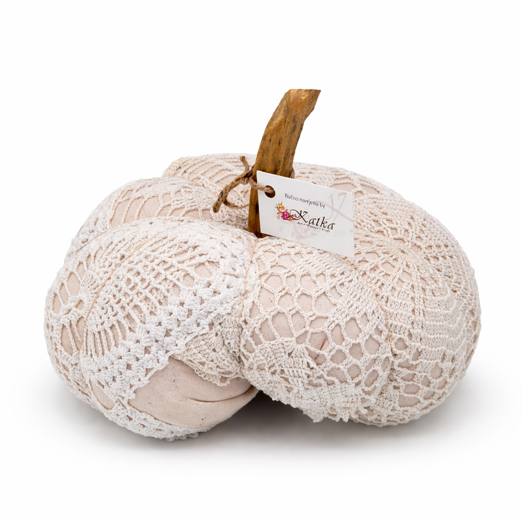 Bučka s čipko je ročno narejen dekorativni izdelek, ki združuje toplino blaga in nežnost čipke. Napolnjena je z mehkim polnilom, ki daje občutek prijetne mehkobe in domačnosti. Vsaka bučka je skrbno sešita in ima naraven pecelj, ki ji dodaja avtentičen videz narave ter poudarja unikatnost ročne izdelave.