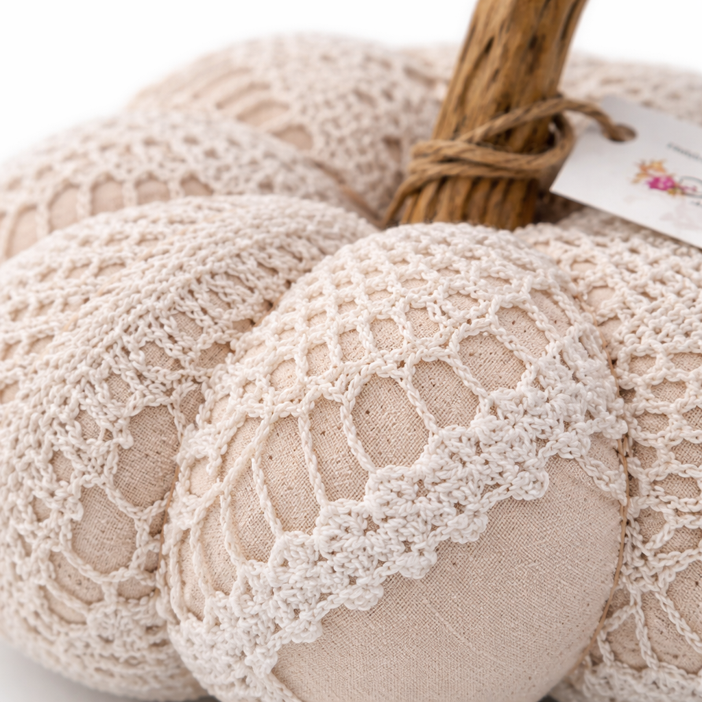 Ročno narejena dekorativna bučka iz mehkega blaga in čipke z naravnim pecljem. Napolnjena z mehkim polnilom, na voljo v različnih barvah in velikostih.