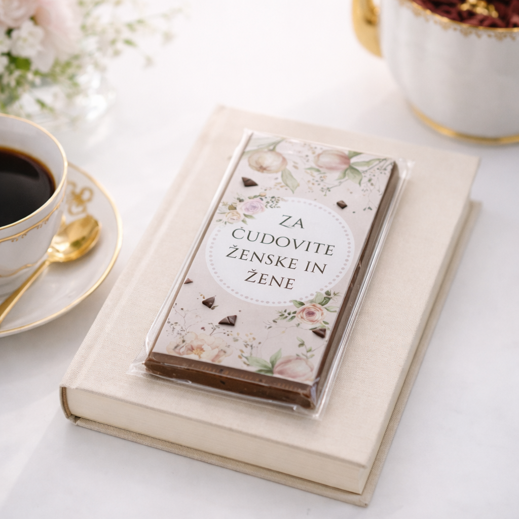 Darilna mlečna čokolada v različnih motivih in napisih. Sladka pozornost za vsakogar in vsako priložnost.