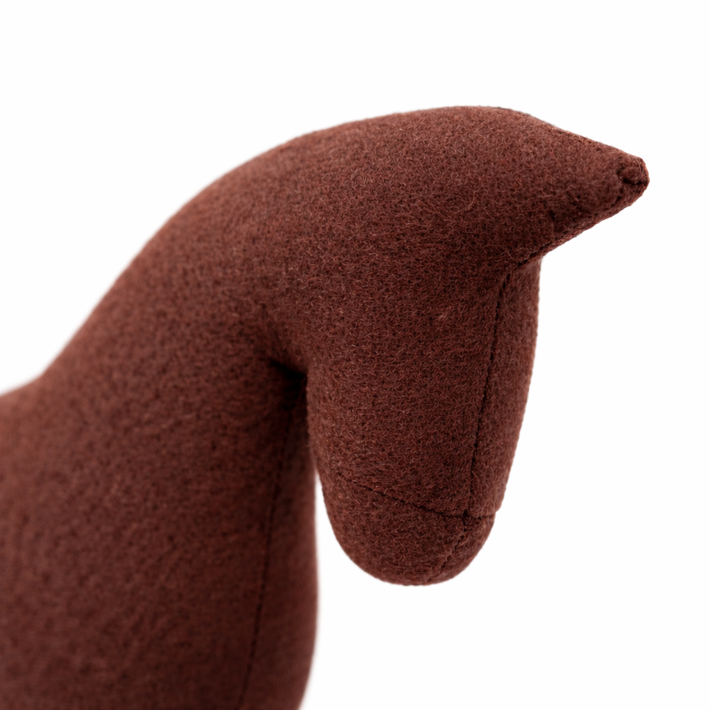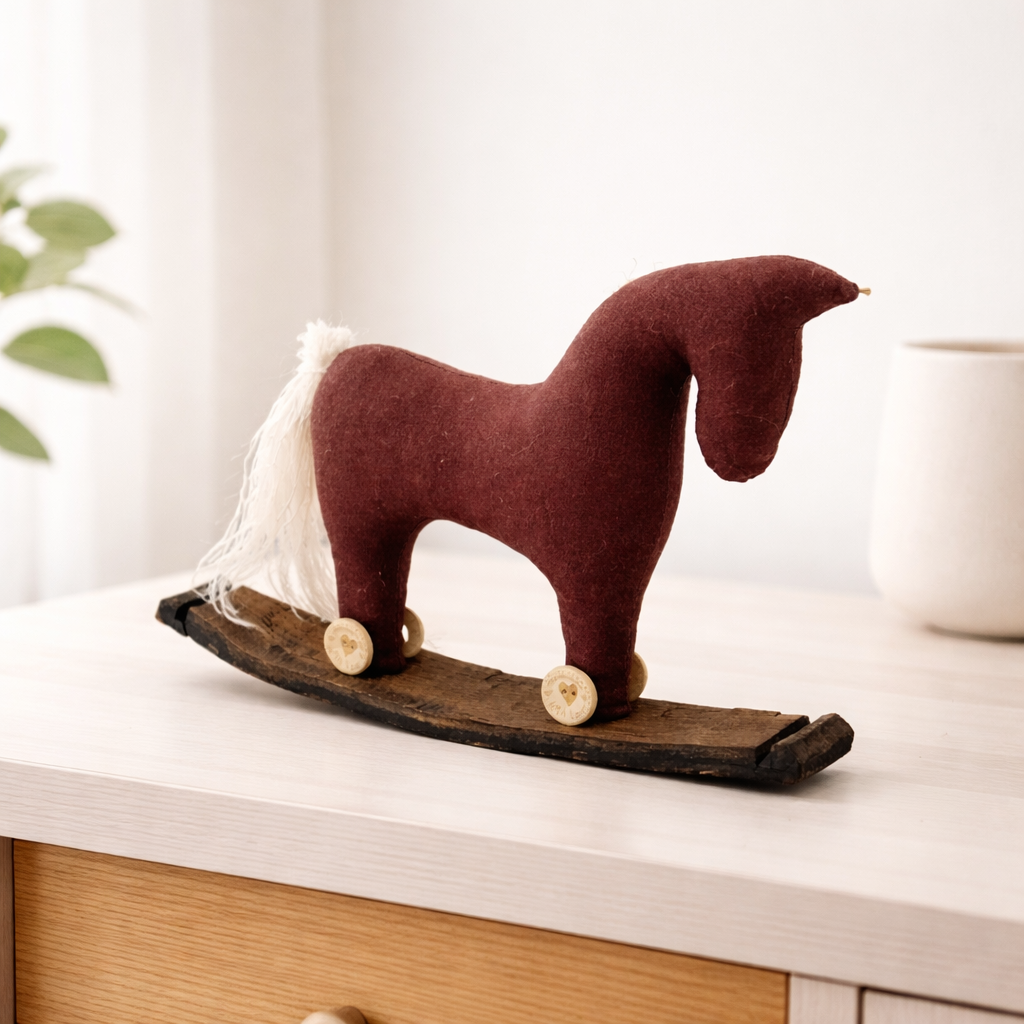 Ročno narejen dekorativni konjiček iz blaga z mehkim polnilom in leseno osnovo. Prikupen okras za dom, na voljo v različnih barvah in vzorcih.