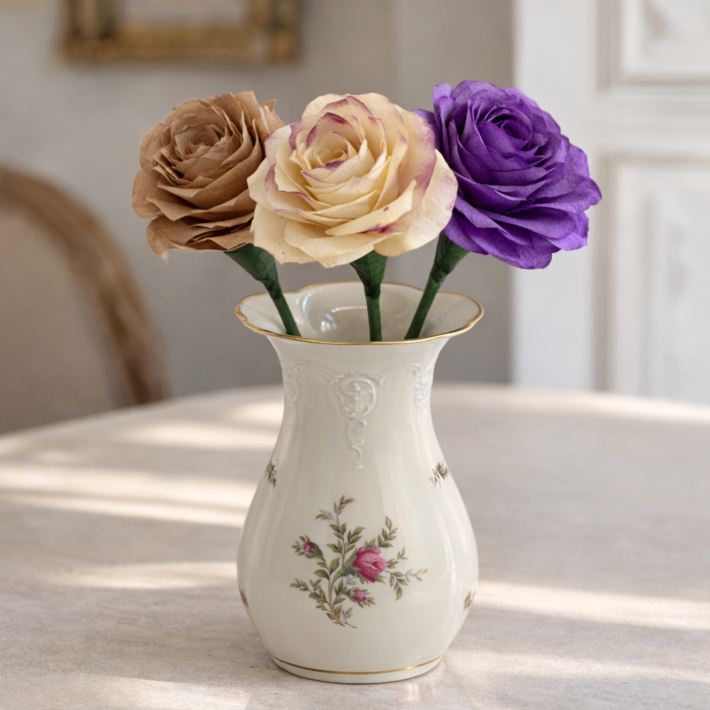 Ročno izdelana dekorativna vrtnica iz kavnih filtrov z upogljivim steblom iz železne žice, ovite z zelenim trakom. Večna in elegantna cvetlica, na voljo v različnih barvah in velikostih.